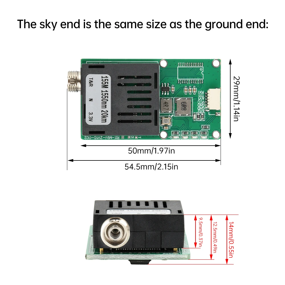 Довжина хвилі оптоволокна з боку неба становить 1310 нм, інтерфейс визначається як: RX/TX/AV/GND/VCC/GND, RX доступ до CRSFTX керування польотом, TX доступ до CRSFRX керування польотом, AV доступ до вихідного порту сигналу AV керування польотом.
